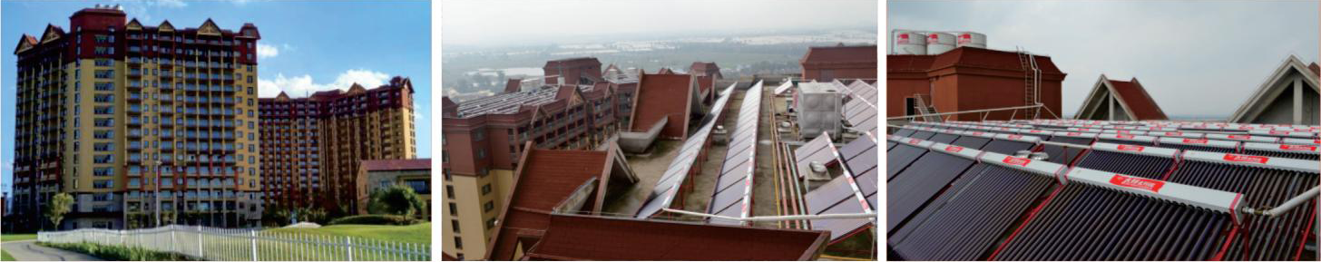 系統(tǒng)概述:安裝真空管集熱器10750管,集熱面積1397.5㎡,系統(tǒng)配置共計(jì)200匹空氣源熱泵輔助系統(tǒng)運(yùn)行