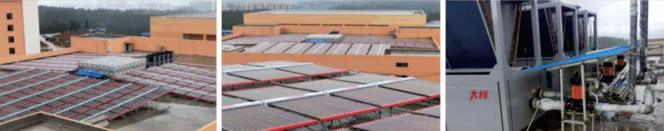 系統(tǒng)概述:安裝真空管集熱器33800管,集熱面積4394㎡,系統(tǒng)配置共計800匹空氣源熱泵輔助系統(tǒng)運行