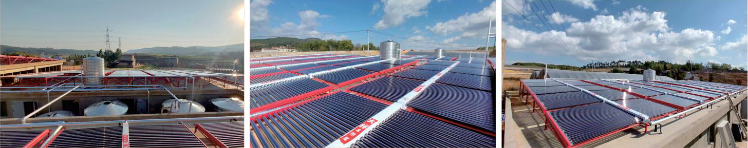 系統(tǒng)概述:安裝真空管集熱器4700管,集熱面積1937㎡,系統(tǒng)配置3臺(tái)10匹空氣源熱泵輔助系統(tǒng)運(yùn)行
